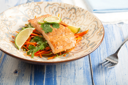 Serve the salmon over the slaw. Garnish with lime wedges and cilantro. Enjoy!